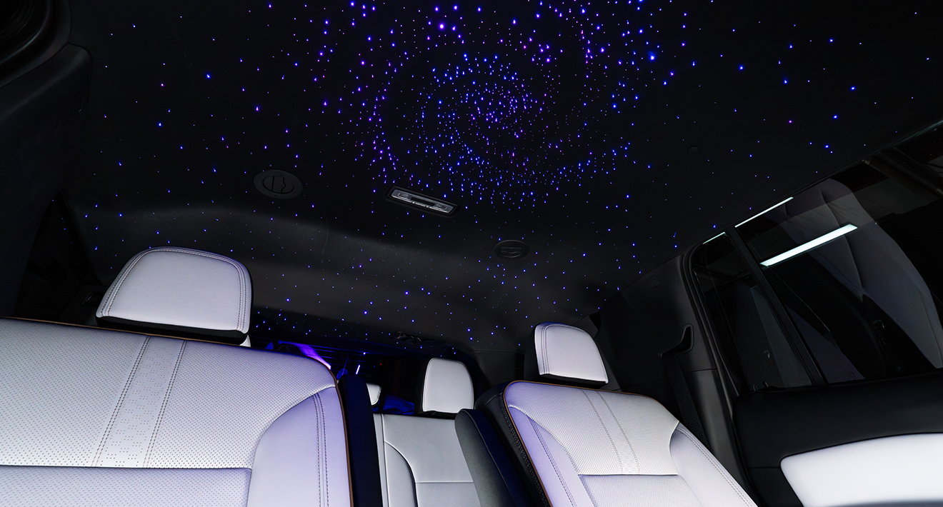 2,000+ stars up top. Bose sound. 17” screen. The vibe says “luxury,” not “minivan.”