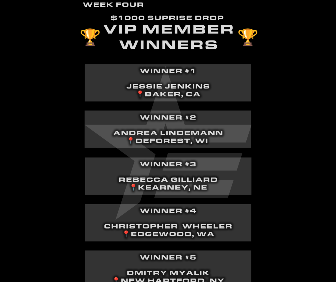 Huge congratulations to Jessie Jenkins (Baker, CA), Andrea Lindemann (DeForest, WI), Rebecca Gilliard (Kearney, NE), Christopher Wheeler (Edgewood, WA), and Dmitry Myalik (New Hartford, NY). 🎉💸