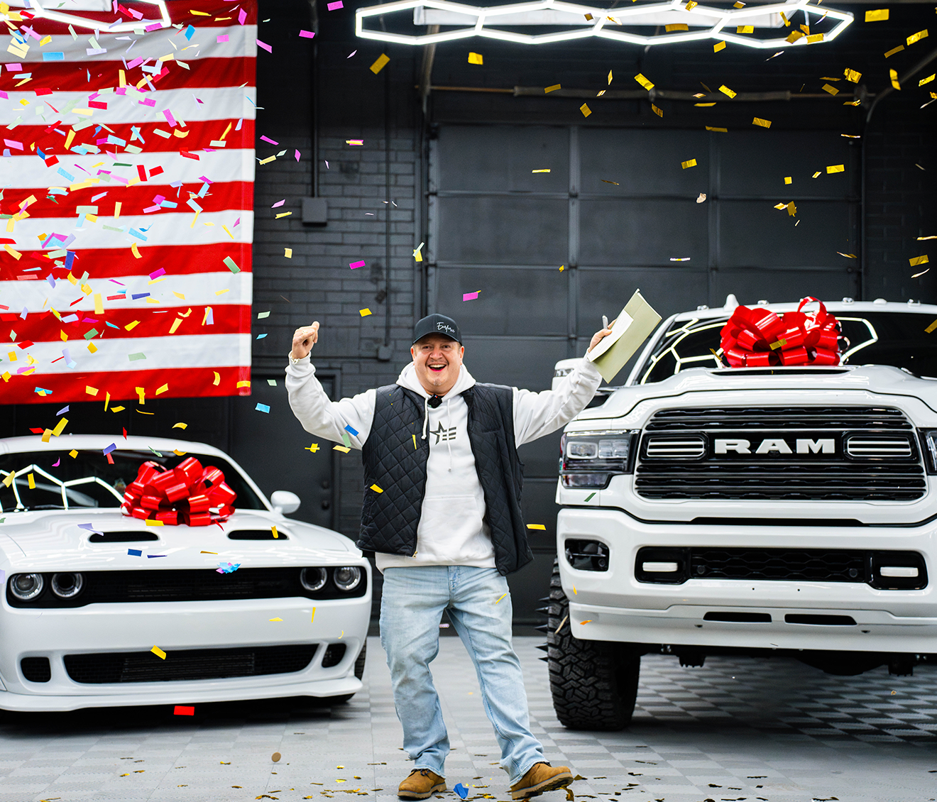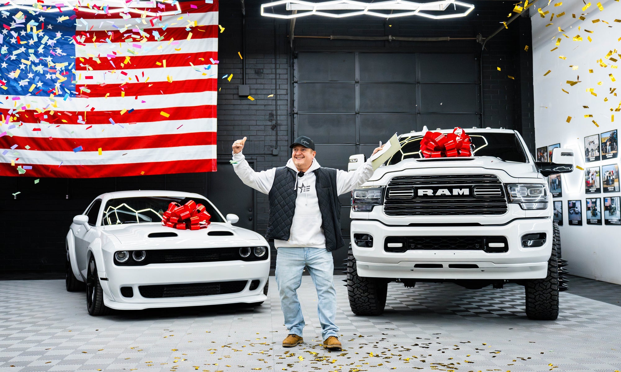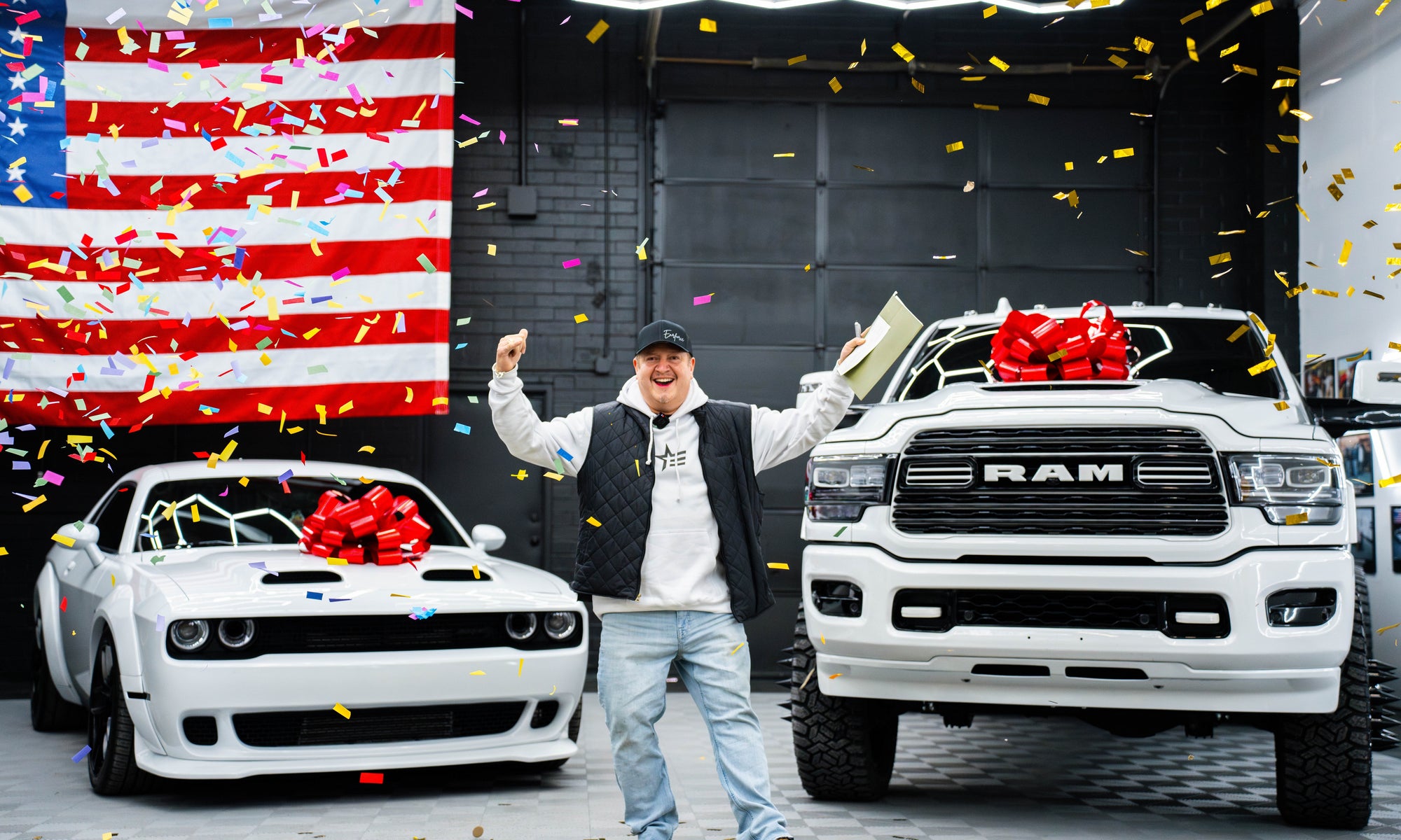 Jerry from Muscatine, Iowa, just hit the jackpot—taking home a Ram 3500 Mega Cab, a Hellcat Redeye, a Futura Lowering Trailer, AND $50,000! 💰🚗🔥