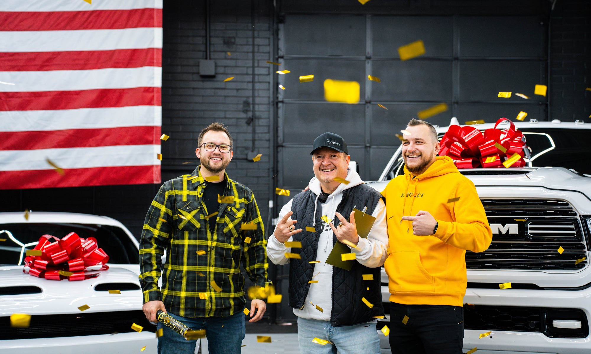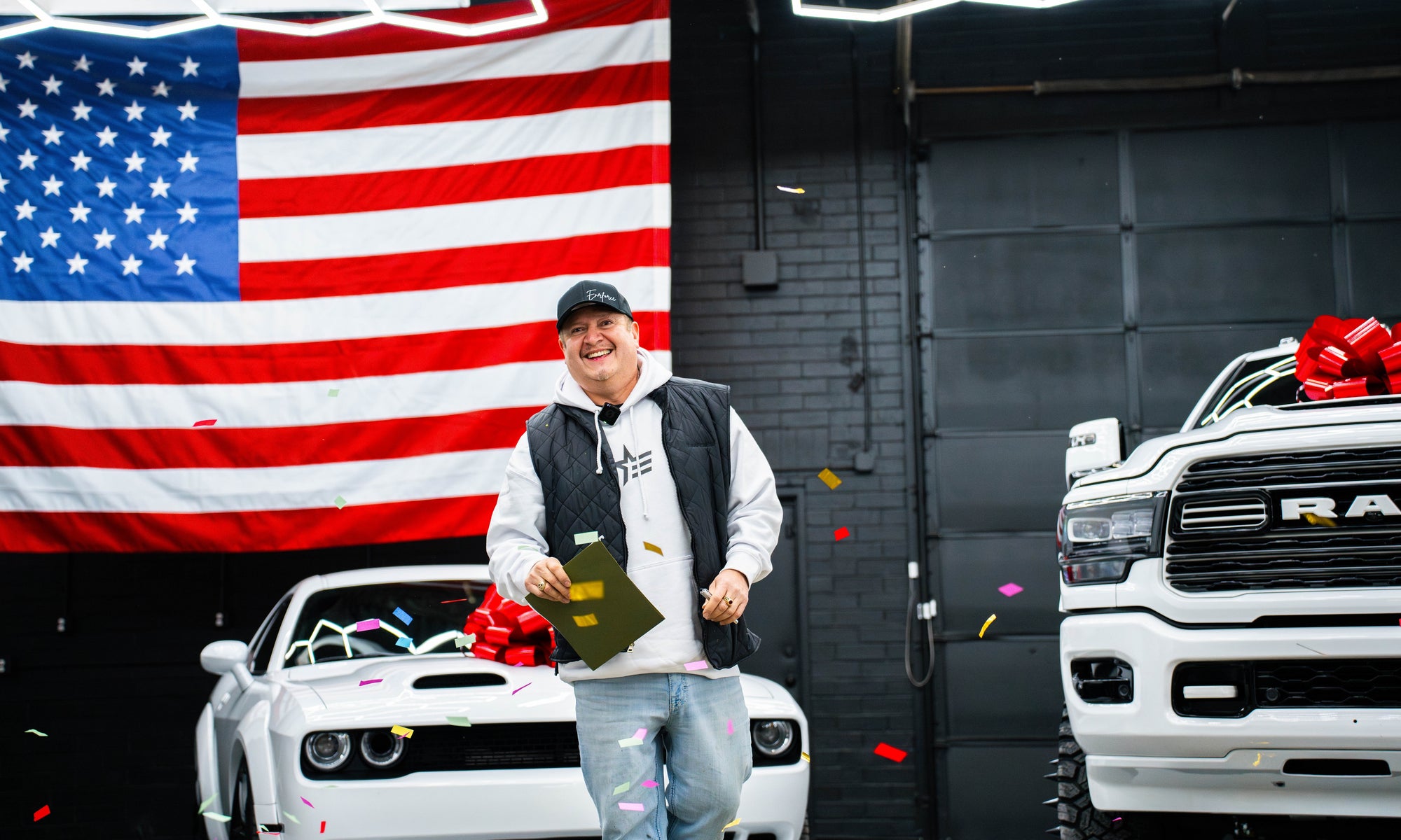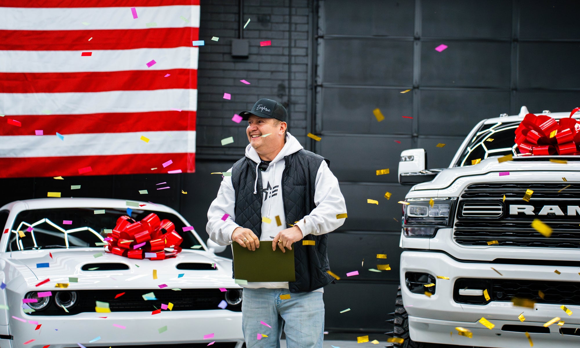 Jerry from Muscatine, Iowa, just hit the jackpot—taking home a Ram 3500 Mega Cab, a Hellcat Redeye, a Futura Lowering Trailer, AND $50,000! 💰🚗🔥